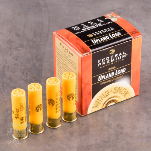 This package contains 250 factory fresh rounds of Federal Premium Wing Shok 20 gauge ammunition. Each 3-inch shotgun shell is loaded with 1 ¼ ounces of buffered #6 shot. Featuring a heavier payload than most shotgun loads, Federal Premium Wing Shok provides a fast speed (1300 feet per second out of the muzzle) for lethal, long-range performance.