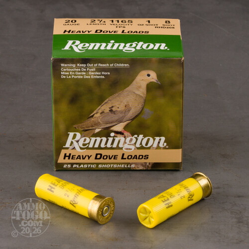 This is 20 Gauge Remington Heavy Dove Load 2 3/4" 1oz. #8 Shot Ammo. The hunter's choice for doves and a wide variety of game bird applications. It comes packed in 25rd. boxes, 10 boxes per case. Muzzle Velocity: 1165 fps.