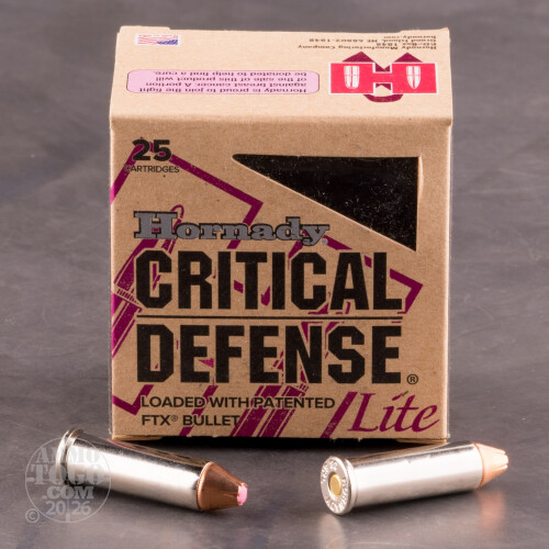 This is 38 Special Hornady Critical Defense 90gr. FTX Hollow Point Ammo. The Critical Defense Lite 38 Special load is an effective, reduced recoil option for ANY shooter looking to minimize the felt recoil of their lightweight, compact personal protection revolver. Designed with the same proven components as the Critical Defense line of ammunition, this offering features a 90 grain FTX bullet with a unique PINK Flex Tip! This ammo is nickel coated brass cased, boxer primed, non-magnetic and non-corrosive. This ammo comes packed in 25rd. boxes.