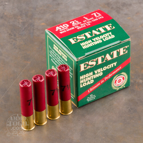 This is 410 Gauge Estate High Velocity Hunting 2 1/2" Max Dram 1/2oz. #7 1/2 Shot Ammo. Estate Cartridge High Velocity Hunting shotshells may be used for a variety of applications both in the field or at the range. This ammo comes packed in 25rd. boxes. Muzzle Velocity: 1200 fps.
