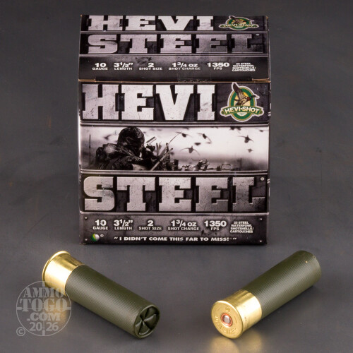 Heavy metal is a type of music that makes teenagers disrespect their elders and stop doing their homework. HEVI-Steel is much better, because it helps hunters fill their bag limit!This 10 Gauge HEVI-Shot shotshell is loaded with #2 shot, the flexible solution for taking either geese or ducks. The shot is of course made of steel for compliance with federal waterfowl hunting laws.