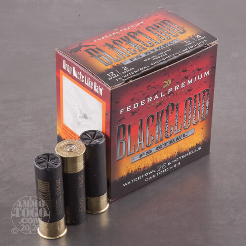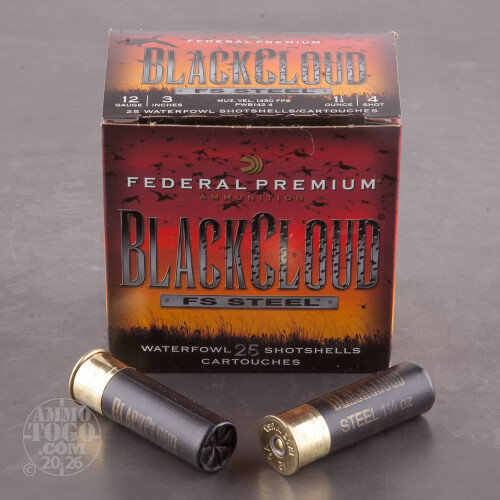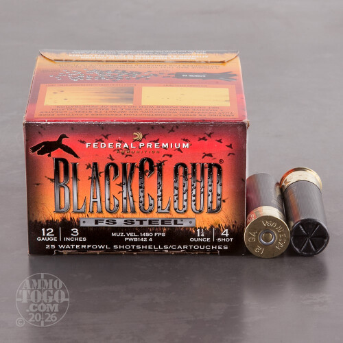 This is .12 Gauge Federal Blackcloud 3" 1 1/4oz #4 Steel Shot Ammo. Federal designed the Black Cloud line of ammo with the duck hunter in mind. The proprietary FliteControl wad gets there faster and FliteStopper steel shot cuts on impact for more devastating penetration.Black Cloud uses a 40%-60% mixture of FliteStopper steel and Premium Steel shot to provide the most consistent pattern with the most stopping power on the market. Safe for all steel-rated barrels, Federal Black Cloud is the must have round for the serious waterfowl hunter. This ammo comes packed in 25 round boxes.