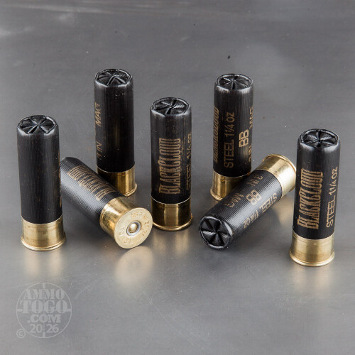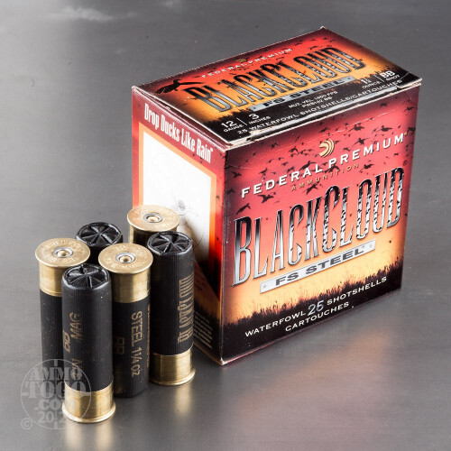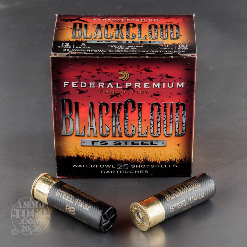 This is 12 Gauge Federal Blackcloud 3" 1 1/4oz. #BB Steel Shot Ammo. Federal designed the Black Cloud line of ammo with the duck hunter in mind. The proprietary FliteControl wad gets there faster and FliteStopper steel shot cuts on impact for more devastating penetration. Black Cloud uses a 40%-60% mixture of FliteStopper steel and Premium Steel shot to provide the most consistent pattern with the most stopping power on the market. Safe for all steel-rated barrels, Federal Black Cloud is the must have round for the serious waterfowl hunter. This ammo comes packed in 25rd. boxes. Muzzle velocity 1450 fps.
