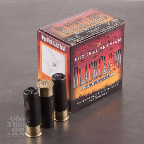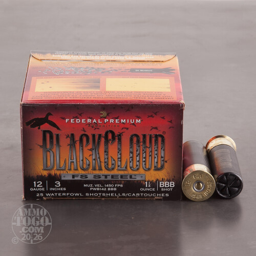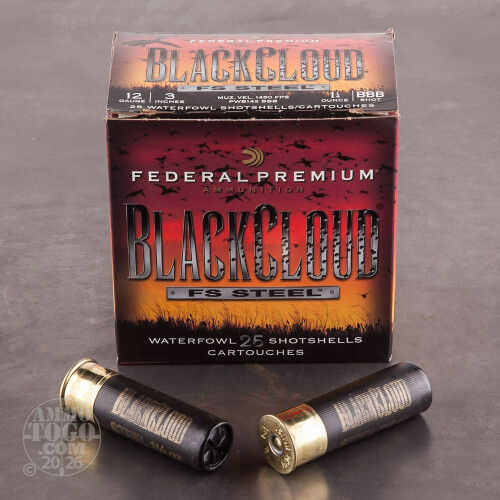 This is .12 Gauge Federal Blackcloud 3" 1 1/4oz #BBB Steel Shot Ammo. Federal designed the Black Cloud line of ammo with the duck hunter in mind. The proprietary FliteControl wad gets there faster and FliteStopper steel shot cuts on impact for more devastating penetration.Black Cloud uses a 40%-60% mixture of FliteStopper steel and Premium Steel shot to provide the most consistent pattern with the most stopping power on the market. Safe for all steel-rated barrels, Federal Black Cloud is the must have round for the serious waterfowl hunter. This ammo comes packed in 25rd. boxes.