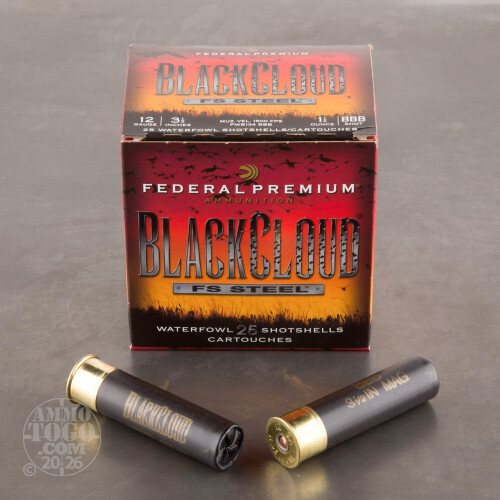 This is .12 Gauge Federal Blackcloud 3 1/2" 1 1/2oz #BBB Steel Shot Ammo. Federal designed the Black Cloud line of ammo with the duck hunter in mind. The proprietary FliteControl wad gets there faster and FliteStopper steel shot cuts on impact for more devastating penetration. Black Cloud uses a 40%-60% mixture of FliteStopper steel and Premium Steel shot to provide the most consistent pattern with the most stopping power on the market. Safe for all steel-rated barrels, Federal Black Cloud is the must have round for the serious waterfowl hunter. This ammo comes packed in 25rd. boxes.