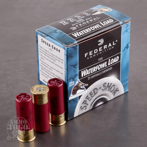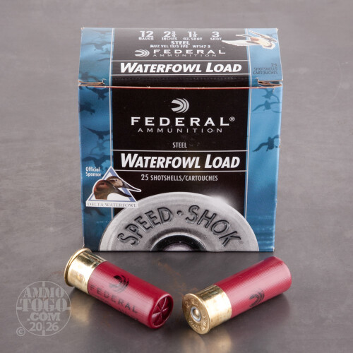 Take ducks and geese cleanly even at extended ranges with this 12 gauge Speed-Shok ammunition from Federal. These 2-3/4" shells fire a 1-1/8 oz. column of #3 steel birdshot at a high muzzle velocity of 1,375 feet per second. They are lead free and deliver excellent patterning. This ammo is loaded in Anoka, Minnesota. Each box contains 25 shells.-