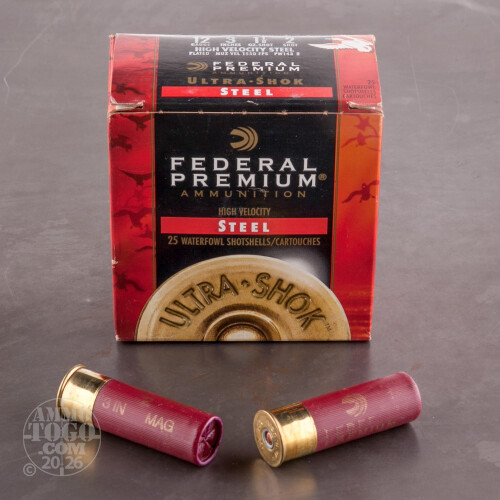 This is 12 Ga. Federal Ultra-Shok 3" 1 1/8oz. #2 High Velocity Steel Shot Ammo. Speed and power is what it’s all about. With High Velocity Steel you’ve got the fastest steel load on the market, that’s quicker to the target for shorter leads at longer ranges and harder hitting on impact. This steel shot ammo features uniformly round plated steel pellets that are corrosion resistant and a high output primer provides consistent ballistic performance at all temperatures. This ammo has water tight seals at the crimp and primer. Comes packed in 25rds. per box.