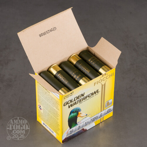 This package contains 25 rounds of Fiocchi Golden Waterfowl 12 gauge ammunition. Each 3-inch shotgun shell is loaded with 1 ¼ ounces of zinc-treated #2 steel shot. Manufactured with hard, functional one-piece plastic wads, reliable clean-burning powders, and quality non-corrosive primers, Fiocchi Golden Waterfowl produces impressive shot patterns and high level reliability and performance.