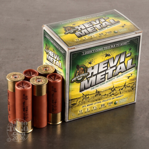 This is 12 Gauge Hevi-Shot 3" 1 1/4oz. Waterfowl #BB Hevi-Metal Ammo. Hevi-Shot's new Hevi-Metal Waterfowl Load uses new Pattern Density Technology to increase the number of pellets on target versus the competition. These shotshells put 20% more lethal pellets on-target at 40 yards than any steel ammunition. More lethal pellets equals more clean kills! Remember - you didn't come this far to miss! This ammo comes packed in 25rd. boxes.