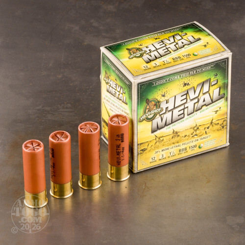This is 12 Gauge Hevi-Shot 3" 1 1/4oz. Waterfowl #BBB Hevi-Metal Ammo. Hevi-Shot's new Hevi-Metal Waterfowl Load uses new Pattern Density Technology to increase the number of pellets on target versus the competition. These shotshells put 20% more lethal pellets on-target at 40 yards than any steel ammunition. More lethal pellets equals more clean kills! Remember - you didn't come this far to miss! This ammo comes packed in 25 round boxes.
