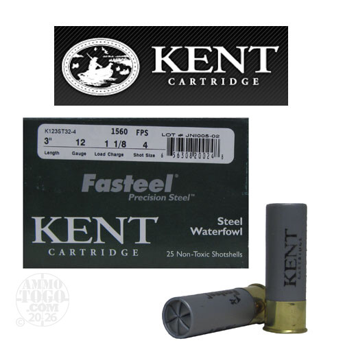 This is 12 Ga. Kent Fasteel 3" 1 1/8oz. #4 Steel Shot Ammo. Kent's Fasteel Waterfowl loads use Precision Steel pellets, advanced powder, and technology to provide a level of performance seldom experienced with steel shot. Kent's quality components and assembly provide superior patterning and extreme performance. Put it all together and Kent Fasteel is a truly premium shotshell that hits hard and true. Muzzle velocity of 1560 fps. That's a lot of knockdown power for any kind of shooting where non-toxic steel is your choice. This ammo comes packed in 25rd. boxes.