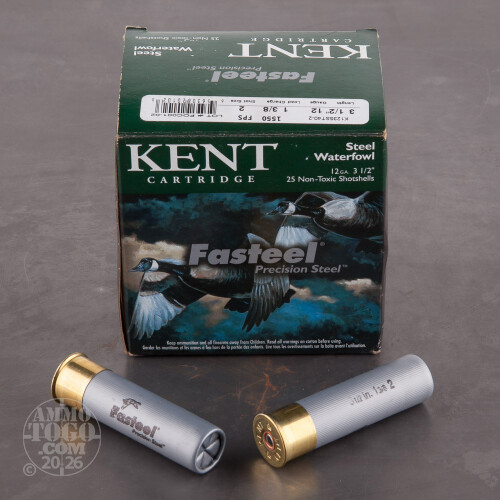This is 12 Ga. Kent Fasteel 3 1/2" 1 3/8oz. #2 Steel Shot Ammo. Kent's Fasteel Waterfowl loads use Precision Steel pellets, advanced powder, and technology to provide a level of performance seldom experienced with steel shot. Kent's quality components and assembly provide superior patterning and extreme performance. Put it all together and Kent Fasteel is a truly premium shotshell that hits hard and true. Muzzle velocity 1550fps. That's a lot of knockdown power for any kind of shooting where non-toxic steel is your choice. This ammo comes packed in 25rd. boxes.