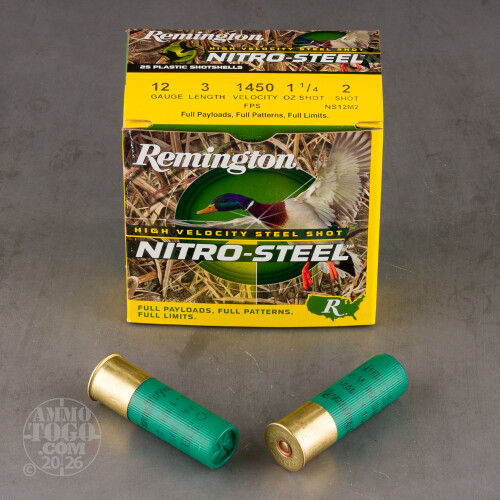 This is .12 Gauge Remington 3" 1 1/4oz #2 Hi-Velocity Ammo. If you are looking for premium performance without the premium price then Nitro-Steel delivers. Greater hull capacity means heavier charges and larger pellets, which makes these loads ideal for large waterfowl. Nitro-Steel delivers denser patterns for greater lethality and is zinc-plated to prevent corrosion. Nitro-Steel is a luxury everyone can afford. This ammo comes packed in 25rd. boxes.