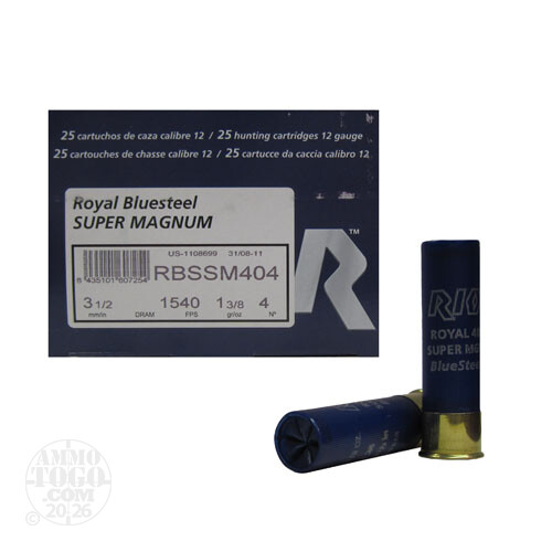 This is 12 Ga. Rio Royal BlueSteel 3 1/2" 1 3/8oz #4 Super Magnum Steel Shot Ammo. Rio Royal uses only the finest materials, depth of research and unwavering commitment to quality, you can be assured that whatever your game, you're taking nearly 200 years of experience into the field with you. This ammo comes packed in 25rd. boxes. Muzzle velocity 1540fps.