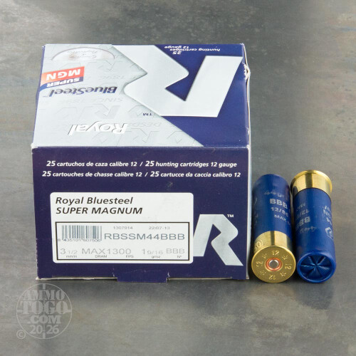 This is 12 Ga. Rio Royal BlueSteel 3 1/2" 1 9/16oz. #BBB Super Magnum Steel Shot Ammo. Rio Royal uses only the finest materials, depth of research and unwavering commitment to quality, you can be assured that whatever your game, you're taking nearly 200 years of experience into the field with you. This ammo comes packed in 25rd. boxes. Muzzle velocity 1295fps.
