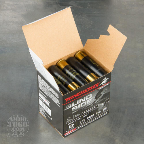 This is 12 Ga. Winchester Elite Blind Side 3 1/2" 1 5/8oz. BB Hex Steel Shot Ammo. This is Winchester's most innovative waterfowl line, Blind Side, which is loaded with Hex shot and a diamond cut wad system. It is designed to hit waterfowl like high-velocity tumbling bricks and it offers the most innovative features and benefits. Muzzle velocity of 1400fps. This ammo comes packed in 25rd. boxes.