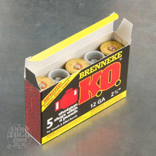 This is 12 Gauge Brenneke K.O. 2 3/4" 1oz. Slug Ammo. The K.O. Slug from Brenneke is more than just a slug, its a philosophy of real knockdown power. These shells are precision made, so you can expect exceptional performance in the field at a very reasonable price. This shell is designed to be an improved Foster-Type slug with an attached wad. K.O. Slugs guarantees outstanding accuracy as well as twice the penetration and 1/3 more energy transfer at the target than traditional slugs. This ammo is packed in 5rd. boxes.