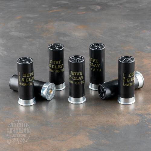 This 12 Gauge shotshell by Browning is loaded with 1 1/8 ounces of #7.5 lead shot -- that’s really the glowingest justification for its “Dove & Clay” designation. Those .095” diameter pellets are excellent for killing delicate upland game when you’d like to keep their trophies intact rather than pulverize them beyond recognition, and their range and spread are ideal for ensnaring a range of critters including grouse, rail, quail, and of course dove. It’s no coincidence that that kind of performance is equally valuable for winning games of trap and skeet as well, making these shells just the thing to reach for no matter how you’ll be enjoying your shotgun’s company.This shell has a responsive primer, fast and clean burning propellant, and a wad that complements its hard shot’s ability to establish a tight pattern upon exiting the muzzle. Browning’s distinctive black hull keeps its contents securely thanks to its tight crimp, and will hold up over the course of multiple reloads if you’d like it to.