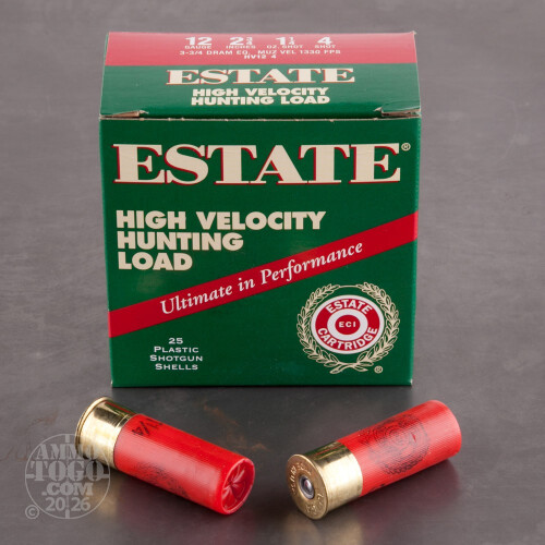 This is 12 Gauge Estate High Velocity Hunting 2 3/4" 3 3/4 Dram 1 1/4 oz. #4 Shot Ammo. Estate Cartridge shotshells may be used for a variety of applications both in the field or at the range. This ammo comes packaged 25rds to a box. Muzzle Velocity: 1330 FPS.