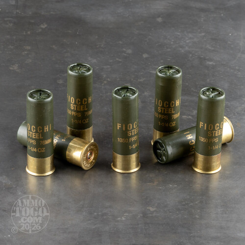 This 12 Gauge shotshell from Fiocchi’s Golden Waterfowl line of ammunition is loaded with 1 1/4 ounces of T shot. The 0.2” diameter pellets possess the heft needed to take down even the burliest ducks -- and won’t disappoint if they find themselves inside of a goose, either. This shell’s shot is made out of non-toxic steel, just what you want to fire around pristine wetlands, and is treated to avoid rusting in damp environments.This shell’s cracking 1,400 fps muzzle velocity compensates for steel’s lesser density than lead’s, and delivers the impact energy needed to knock ducks out of the sky. Fiocchi’s wad will keep their exceptionally hard steel shot from etching the inside of your barrel, and is designed to keep its payload close together before cleanly separating from it. Add in a responsive primer, clean burning charge of propellant, and brass headed hull that’s strong enough to make multiple trips through a chamber, and you’ve got one of the best duck hunting shells on the market!