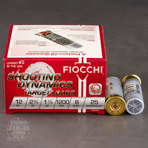 This is 12 Gauge Fiocchi Heavy Target Shooting Dynamics 2 3/4" 1 1/8oz. #8 Shot Ammo. Fiocchi's Target Shooting Dynamics line provides both competition shooters and the amateur clay shooters a selection of high performance rounds without the requisite price tag. Recoil in these shells are kept low without dramatically impacting velocity, a great benefit for those longer matches. Overall, a great performer at a great price. This ammo comes packaged 25rds. to a box. Muzzle Velocity: 1200 fps.