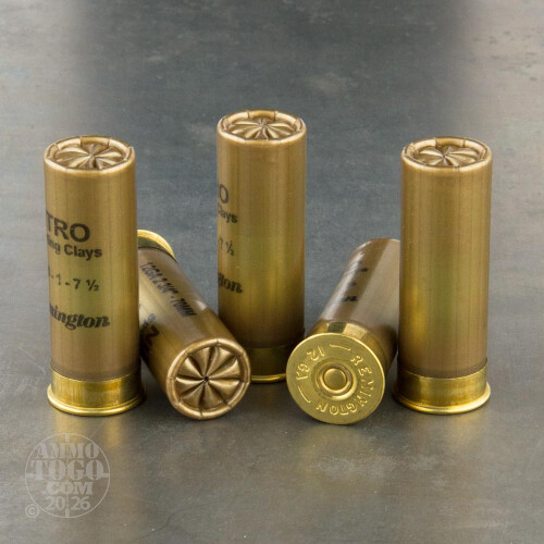 This is 12 Gauge Remington Premier Nitro Sporting Clays 2 3/4" 1oz. #7 1/2 Shot Ammo. Remington's Target Loads have taken shot-to-shot consistency to a new performance level, setting the standard at all major skeet, trap, and sporting clays shoots across the country, while providing handloaders with unmatched reloading ease and hull longevity. Available in most gauges, our shells are the most reliable, consistent and most reloadable shells you can shoot. The Remington Premier Nitro 27 shotshell has become commonplace on the nation’s trap fields and sporting clays ranges due to its consistent velocities and pattern uniformity. Not to mention its unique gold hull that is known to be one of the most "reloader friendly" designs to hit the clay target shooting world. To meet the special demands of avid sporting clays shooters, we developed a new Premier Nitro Gold Sporting Clays target load. At 1350 fps, the extra velocity gives you an added advantage for those long crossers—making target leads closer to normal for ultimate target-crushing satisfaction. Also makes a great high-velocity dove load. This ammo comes packaged 25rds to a box. Muzzle Velocity: 1350 FPS.