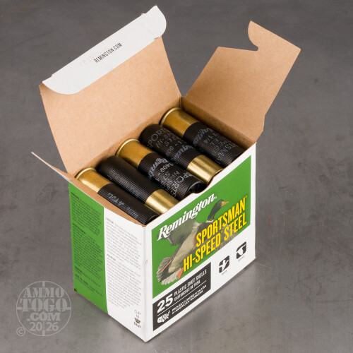 This package contains 25 rounds of Remington Sportsman Hi-Speed Steel 12 gauge ammunition. Each 3-inch shotgun shell is loaded with 1 ¼ ounce of #7 steel shot. Leaving the muzzle at a velocity of 1400 feet per second, these specialty steel game loads are perfect for short-range, high-volume shooting during early duck season and even upland situations requiring non-toxic, lead-free ammunition.