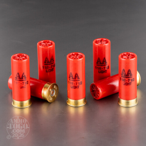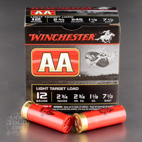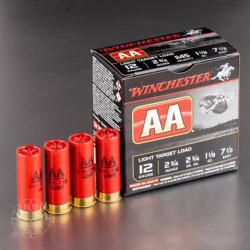 These multi-role 12 gauge shells from Winchester are not only great for skeet and trap games but for upland feathered game as well! Each of these shotshells has a high strength hull for moisture resistance, one of Winchester's 209 primers for dependable ignition, and the famous AA wad. Winchester's AA wad design has a perfectly measured rate of collapse which makes the best use of propellant gases in order to produce higher velocity and relatively tighter patterns at distance. These patterns are further improved by the AA wad's petals which contain the pellets and open up at a specific rate for precise release.As Light Target shells, these rounds exhibit less recoil to a balance between powder measure and the AA wad. Each shell contains 1-1/8 ounce of hardened #7-1/2 shot which is appropriate for dove, quail, woodcock, and wingless clay pigeons. Hardened shot pellets more readily maintain their round shape in order to reduce fliers; this augmentation also penetrates deeper in game birds and breaks clays with proficiency. Winchester ammunition is American made and backed by over a century in caliber development, professional lab research, and real world feedback from the field.