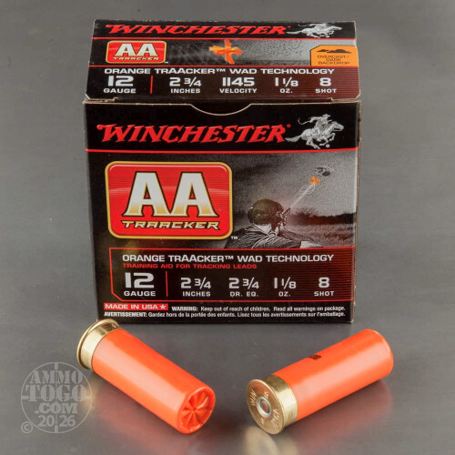 These 12 gauge shells from Winchester are perfect for introducing new shooters to the skeet range for some clay-bursting action! These 2-3/4 inch shells are loaded with 1 1/8 ounces of #8 shot which is backed by the specially designed AA TrAAcker wad. The TrAAcker wad in this particular load features a blaze orange color for easy trajectory recognition and instruction on shot tracking.In addition, this proprietary wad design has a cup in the middle which traps shot as well as long petals which unfold and allow it to be propelled with the shot cloud; this not only extends the effective range but provides a tight patterning handicap to new shotgunners in training. Winchester is a trusted American name in classic firearms and modern ammunition and has a longstanding tradition of supporting sport shooting of all kinds!