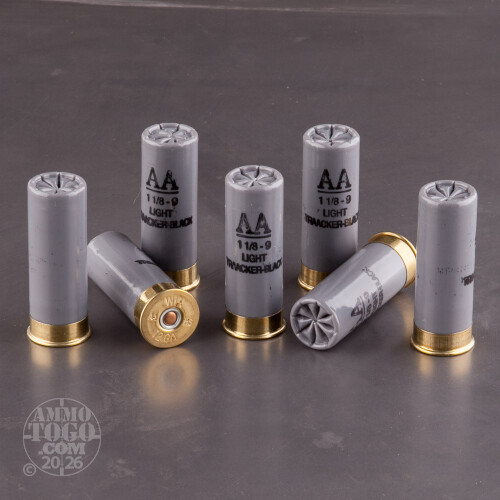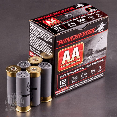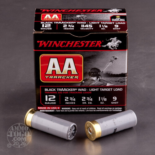 Winchester's TrAAcker shotshells breathe new life into some classic skeet loads with a dash of color! The high strength hulls used to contain these rounds are colored black and signify that the AA wad inside is black as well; this dark color contrasts sharply against a clear sky for easy shot tracking as the wad flies with the shot. That makes these 12 gauge shells excellent for coached training or introducing new shooters to the clay sports. Aside from the new look, Winchester's AA wad maintains the same functionality with a obturating powder rear, collapsing center, and shot-trap core surrounded by helical petals which all contribute to less felt recoil, maximized velocity, extended effective range, and overall tighter shot pattern.These 2-3/4 inch shells are compatible with the widest range of pump, side-by-side, over-under, and semi-automatic shotguns and contain 1-1/8 ounces of #9 shot. The lead shot undergoes a hardening process before being loaded which helps the pellets maintain round shape and reduces the chances of fliers leaving the pattern cloud. The black TrAAcker hull spins as it travels and maintains position in the middle of the shot cloud for rapid recognition of a hit or miss. Winchester ammunition is American made and has been constantly improved using input and feedback from shooters of all disciplines for the last 150 years.
