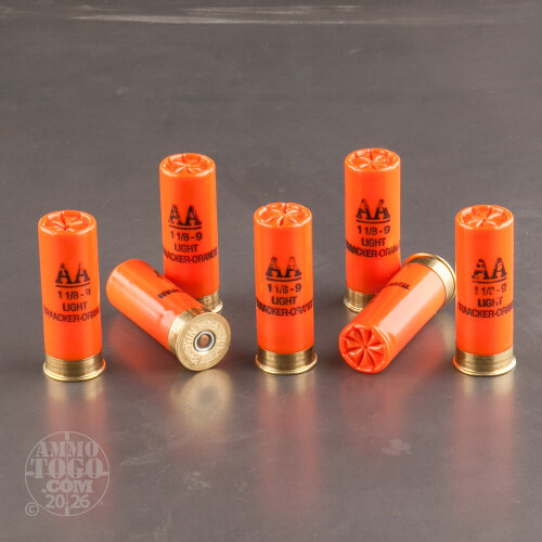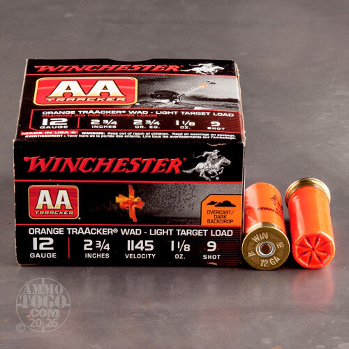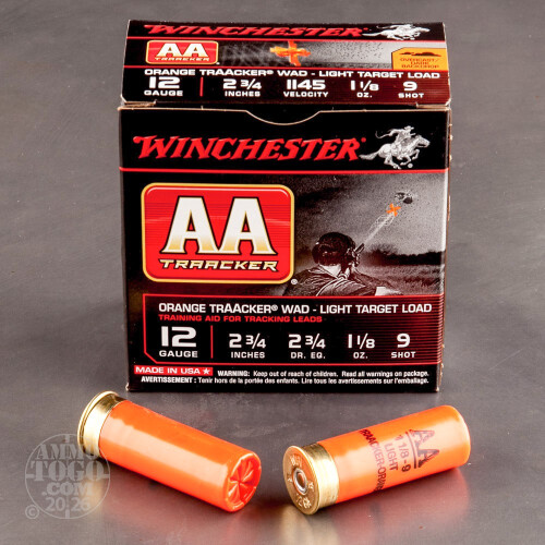 Update your skeet range training methods with the colored hulls of Winchesters TrAAcker target loads. When you fire these 12 gauge rounds, you'll see a bright blaze orange wad travel in the center of your shot for trouble-free tracking against an overcast sky. That makes is painless to understand your hits and misses on a cloudy day and make adjustments as necessary. These shotshells are 2-3/4" in length for universal compatibility and also have orange colored hulls for easy identification.Each shell is assembled with premium components such as Winchester's own 209 primers, consistently burning powder, 1-1/8 ounce of hardened #9 shot, and the famous plastic AA wads. The AA wad has been a strong enhancement to factory and home-brew shells for the past 50 years and the fresh coat of paint hasn't changed a thing; these wads still provide tighter patterns, longer effective range, and softer felt recoil. Winchester's shotshells are manufactured in the state of Illinois and embody the tradition of American hunting using proven quality inspection methods alongside evolutionary production techniques.