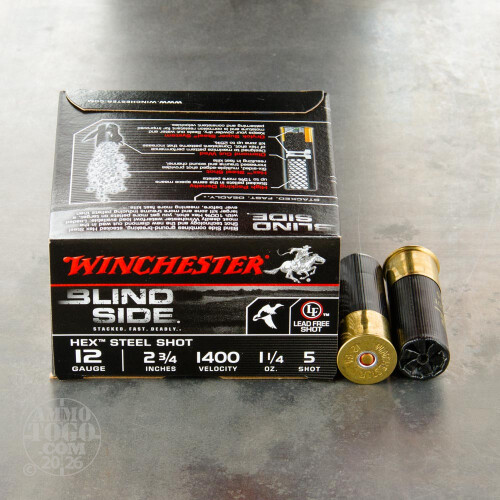 Winchester Blind Side is a great choice for waterfowl hunting. These 2-3/4" shells are loaded with 1-1/4 oz. Hex Steel Shot that leave the muzzle at 1,400 feet per second. Winchester uses a high packing density and diamond cut wads to improve pattern consistency. These high quality and reliable shells are non-toxic and utilize a hex shaped shot that stack more efficiently in the hulls.-