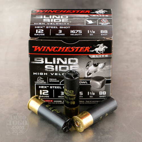 Winchester's Blind Side 12 Gauge shells are a great choice for waterfowl hunting. These 3" hulls have a 1-1/8 oz. payload of BB steel shot. Winchester uses hex shaped shot that stacks more efficiently in the shells. The result tighter patterns, more powder and more velocity (1,675 feet per second). Winchester has a reputation for providing hunters with high quality, dependable ammo.-