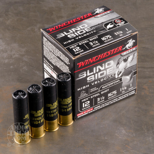 This large waterfowl load from Winchester's Blind Side series features 1-3/8 oz. of #1 hex shaped shot packed densely into a 3-1/2" shell. Such an efficient arrangement makes room for a more powerful powder charge, enabling this load to achieve a muzzle velocity of 1,675 feet per second. Such a high velocity generates more dependable patterning and makes those tougher shots against more distant birds feasible. This US-made ammo is lead free and complies with environmental regulations on hunting in wetland habitats. Each box contains 25 shells.