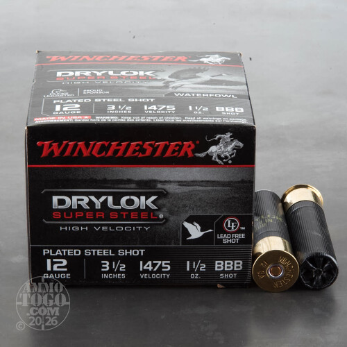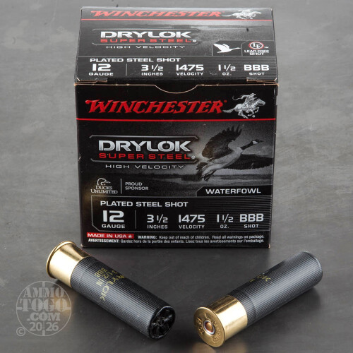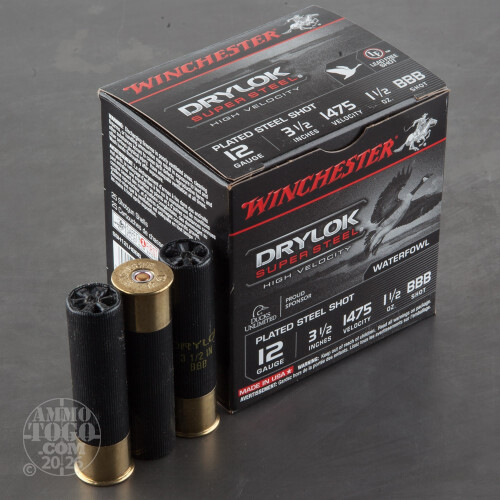 Winchester's Drylok Super Steel ammo is designed to withstand the potentially harsh conditions of waterfowl hunting. Drylok super steel shells have a lacquered primer and a water resistant wad. These shells can be completely submerged in water and still fire with out flaw. The steel shot in this ammo is plated to prevent the steel from rusting or corroding, which ensures that your shot will have consistent patterns even in the worst conditions.This ammo is loaded with 1 1/2 ounces of BBB shot in a 3 1/2 inch shell. These shell have enough power to take down any waterfowl that flies into your area. Order your ammo, and bag some birds!