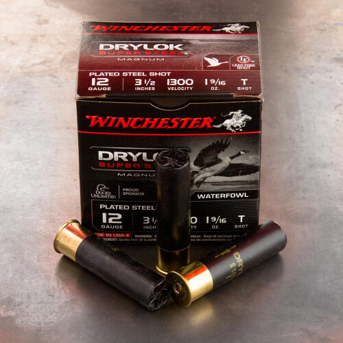 Winchester has designed these 12 gauge shells to be as rugged as you are and function in whatever environment that the hunt may take you. This load combines the efforts from a lacquered primer, a moisture-resistant hull, a separated shot-containing cup, and the Drylok Super Steel wad in order to keep the round functional and effective in any condition. With a 3-1/2 inch shell length and a high brass powder charge, shooters can expect these shells to reach out and smack down geese and cranes with startling efficiency at extended ranges.Each round contains 1-9/16 ounces of T size steel shot pellets which each measure a fifth of an inch in diameter and are well-suited for taking big birds. Steel shot is legal for use in lead-free wetlands and deposits less toxic residue into meat that you intend to consume. The steel pellets are also plated for increased corrosion resistance alongside denser shot clouds at longer distances. Winchester has served the American public and military with inventive ammunition types and innovative firearm actions for nearly 150 years. Their vast experience comes together with modern manufacturing practices in order to bring excellent products to hunters, police officers, competitors and recreational shooters across the country.
