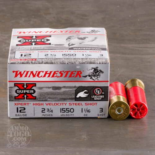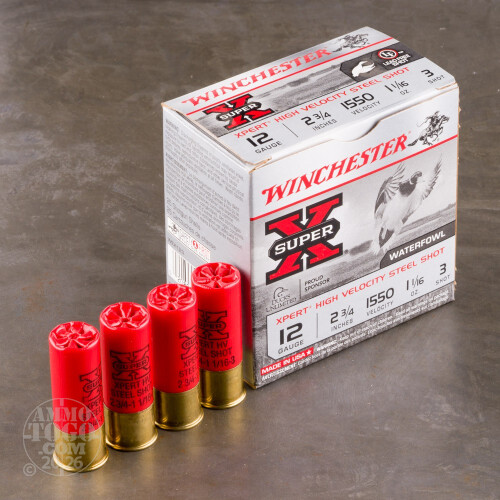 These high velocity shells from Winchester are a great choice for waterfowl hunters. Each round in this box of 25 is 2-3/4" and carries a 1-1/16 oz payload of #3 steel shot. These shells are suitable for both ducks and geese and have a muzzle velocity of 1,550 feet per second. Hunters have trusted the Winchester name for 150 years. These high quality shells have one-piece hinged wads and powerful high brass cases. The results are hard hitting shells that have long-range knock-down power.-