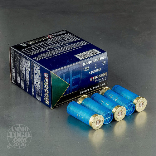 This is 12ga Fiocchi SUPER CRUSHER 2 3/4" 1oz. #7 1/2 Shot Target Ammo. Fiocchi has been manufacturing ammunition in Ozark, Missouri since 1986 and in Europe since 1876. Fiocchi ammunition is manufactured with pride from the finest raw materials and components.Built with hard, uniform, functional one-piece plastic wads, clean consistent powders and consistent non-corrosive primers. Premium materials and strict, exacting standards of quality and consistency make Fiocchi a worldwide leader in innovation and design. This ammo comes packed in 25rd. boxes. Muzzle Velocity: 1400 fps.