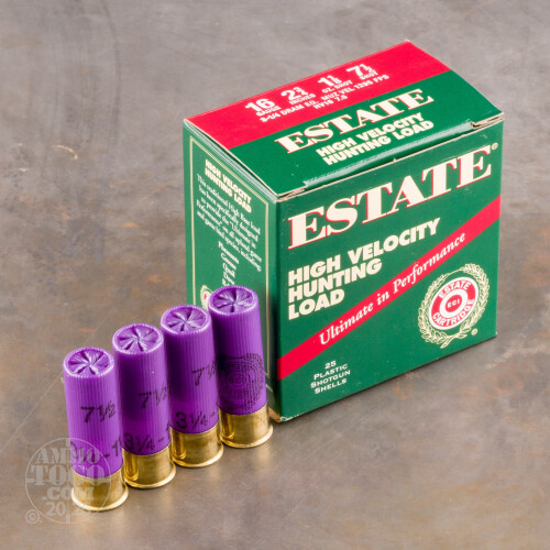 This is 16 Gauge Estate High Velocity Hunting 2-3/4" 1-1/8oz. #7-1/2 Shot Ammo. The traditional High Base load has been specifically designed to provide the "Ultimate in Performance" on all upland game and game bird species, including pheasant, grouse, quail,dove, rabbit, and squirrel. This ammo comes packaged 25rds. to a box. Muzzle Velocity: 1295 fps.