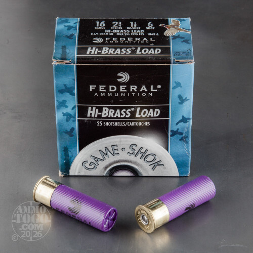 This is 16 Gauge Federal Game-Shok 2 3/4" 1 1/8oz. #6 Shot High Brass Ammo. This is a quality upland game shotshell at an affordable price. This hi-brass load has a muzzle velocity of 1295fps. and provides superior performance on your favorite small game. Comes packed 25rds. per box.