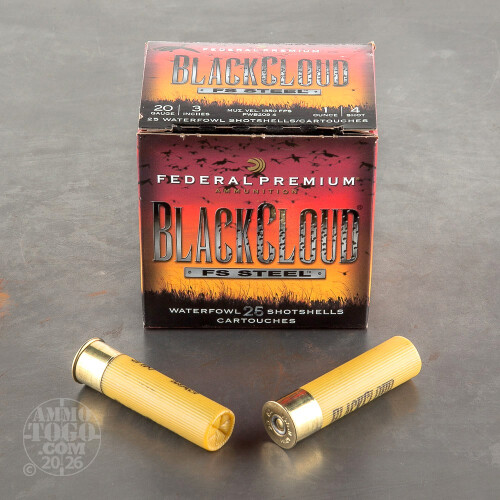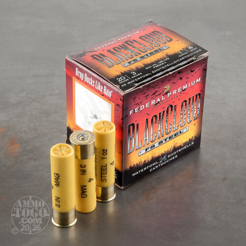 This is 20 Ga. Federal Blackcloud 3" 1oz #4 Steel Shot Ammo. Federal designed the Black Cloud line of ammo with the duck hunter in mind. The proprietary FliteControl wad gets there faster and FliteStopper steel shot cuts on impact for more devastating penetration.Black Cloud uses a 40%-60% mixture of FliteStopper steel and Premium Steel shot to provide the most consistent pattern with the most stopping power on the market. Safe for all steel-rated barrels, Federal Black Cloud is the must have round for the serious waterfowl hunter. This ammo comes packed in 25 round boxes.