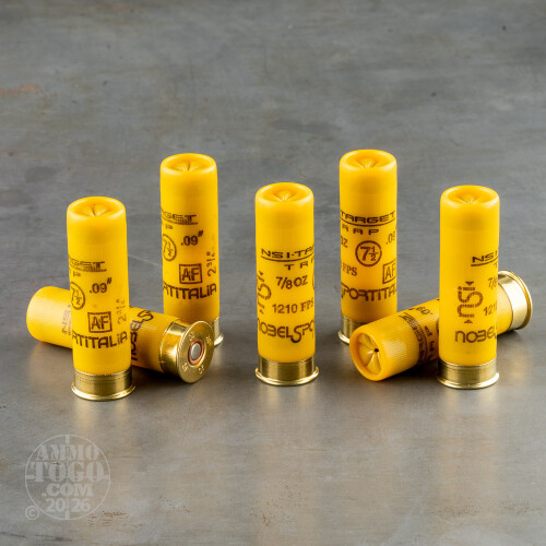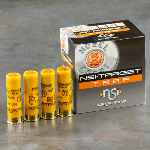This is 20 Gauge NobelSport Hunting 2 3/4" 2 1/2 Dram 7/8oz. #7 1/2 Shot Ammo. This Shotgun Ammo is manufactured by NobelSportItalia in Italy and they are premium quality shells. There is a difference in hunting cartridges! Many manufacturers use cheaper, softer shot or lesser grade powder and components to save money. In today's world, there are just too few opportunities to make that "shot of the day" to accept anything but the highest quality hunting shotshells available. NOBELSPORTITALIA Hunting shotshells are assembled on the same machines, by the same craftsmen, to the same standards and using the same 21st century technology as NOBELSPORTITALIA's world class target shotshells, which are world renowned for there quality and are used by many competitive shooters. Only the finest plastic cases, high antimony hard shot, even patterning wads and famous NOBELSPORT 209 primers are used in NOBELSPORTITALIA Hunting shotshells. These are the best hunting shotshells that money can buy. This ammo is packed in 25rd. boxes, 250rds. per case.