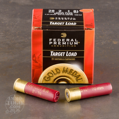 This is 28 Gauge Federal Gold Medal Target 2 3/4" 3/4oz. #8 1/2. Federal Premium Gold Medal Plastic Target Shotshells provide optimum performance in all clay target disciplines. These target loads feature tournament grade components, consistent velocities, and uniform patterns which deliver hard hitting, target breaking performance. Muzzle velocity is 1230 fps. This ammo is packed in 25rd. boxes.