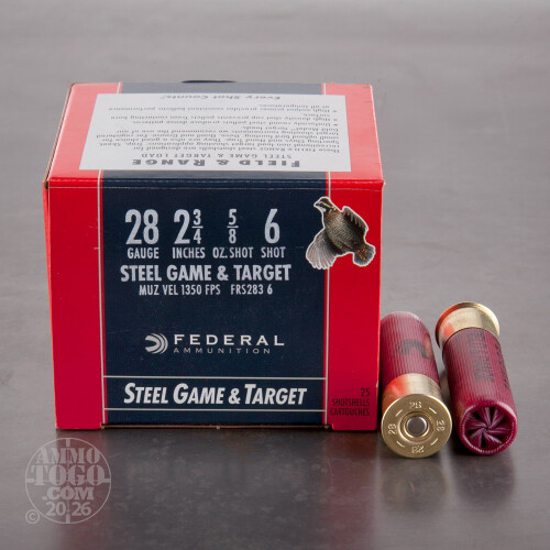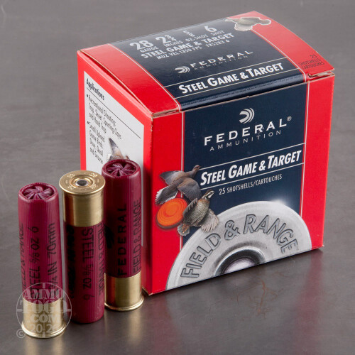 This is 28 Gauge Federal Steel Game and Target 2 3/4" 5/8oz. #6. These field and range shotshells are designed for upland game and recreational target shooting applications including Trap, Skeet, Sporting Clays and Hand Trap. This ammo is packed in 25rd. boxes.