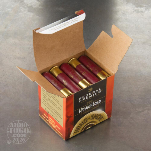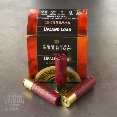 This is 28 Gauge Federal Wing Shok Upland Load Hi Brass 2 3/4" 2 1/4 Dram 3/4oz. #8 Shot Ammo. Wing-Shok loads feature extra-hard copper-plated shot for tighter patterns, less feather draw and maximum penetration. If you're serious about upland bird hunting, this is your ammunition. For roosters, grouse, chukar, quail and more, you've got confidence when you shoot the best. Hi-Brass loads provide superior performance on your favorite small game. It comes packed in 25rd. boxes. Muzzle Velocity: 1295 FPS.