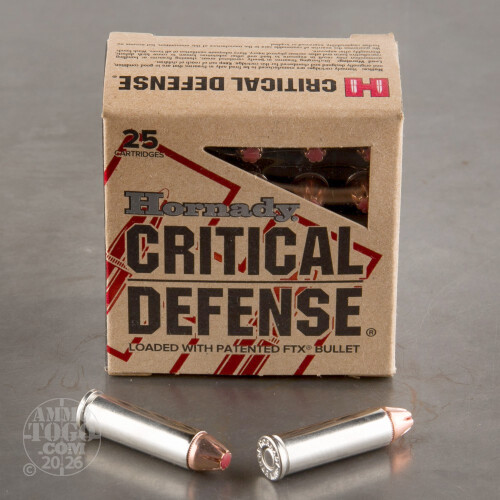 This is 32 H&R Mag Hornady Critical Defense 80gr. FTX Hollow Point Ammo. Conventional hollow point pistol bullets have always had issues with the cavity becoming clogged with fibers from clothing which rendered them ineffective in terms of expansion in soft tissue after encountering the clothing barrier. Critical Defense eliminates this issue - guaranteed. Critical Defense ammo is so effective because of the soft polymer insert in the tip of the bullet. It is rigid enough to prevent clogging when passing through clothing, yet supple enough to deliver violent terminal performance when the bullet encounters soft tissue - EVERY single time. Additionally, all Critical Defense ammunition is loaded with nickel cases to eliminate corrosion and aid in low-light situations, plus its premium low flash propellants deliver maximum velocity, even in very short-barreled handguns. You can trust you and your family's safety to the only handgun ammunition specifically engineered to deliver 100% consistent performance every single time - Hornady Critical Defense. This ammo is brass cased - nickel coated, boxer primed, non-magnetic, and non-corrosive. It comes packed in 25rd. boxes. Muzzle Velocity: 1150 fps.