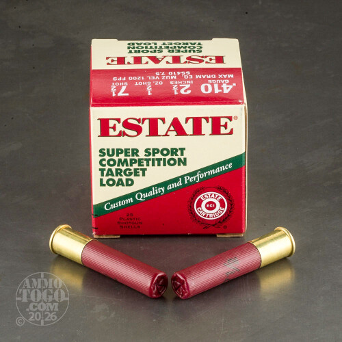 This is 410 Gauge Estate Super Sport Competition 2 1/2" Max Dram 1/2oz. #7 1/2 Extra Hard Shot Ammo. Estate Cartridge Super Sport Competition Target shotshells may be used for a variety of applications both in the field or at the range. This ammo comes packed in 25rd. boxes. Muzzle Velocity: 1200 fps.