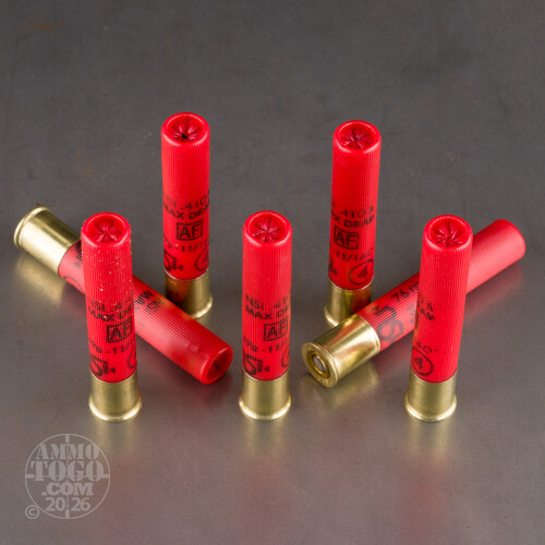 This 410 Bore shell by Nobel Sport Italia features 11/16 ounces of #4 high antimony hard shot pellets, making it appropriate for turkey with a full or extra full choke, or for pheasant and rabbit with a modified or improved cylinder choke. Its shot’s hardness will tighten your spread at a distance, giving you an advantage while hunting for game that is further away.Nobel Sport Italia implements great attention to quality in every shell that they manufacture. This shell’s even patterning wad, proprietary 209 primer, and sturdy plastic casing are all indicative of that commitment, so it is no wonder why their ammunition is favored by Olympic skeet shooters.
