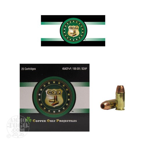 This is .45 ACP Rare Ammo COP 185gr. +P Solid Copper Hollow Point Ammo. This is Rare Ammo's new line of C.O.P. (Copper Only Projectiles) premium lead-free, solid copper hollow point ammunition. The proprietary manufacturing process and rigourous testing have resulted in a superior product. Independent testing has proven that the C.O.P. line of ammunition outperforms all others. Perfect for law enforcement, better for the environment. Muzzle velocity of 1060fps. This ammo is packed in 25rd. boxes.