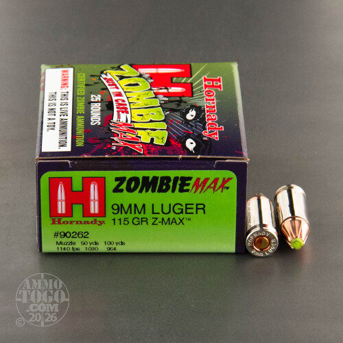 This is 9mm Hornady Zombie Max 115gr GR Z-MAX Ammo. Be prepared – supply yourself for the Zombie Apocalypse with new Hornady Zombie Max ammunition! This round is loaded with proven Z-Max bullets. Make sure your "bug out bag" is ready with nothing but the best! Stay focused! Zombies will try to distract you by waving their arms all over. Destroy their brain before they try to eat yours! This ammo is brass cased, boxer primed, non-magnetic, and non-corrosive. It comes packed in 25rd. boxes. Muzzle Velocity: 1140 fps.